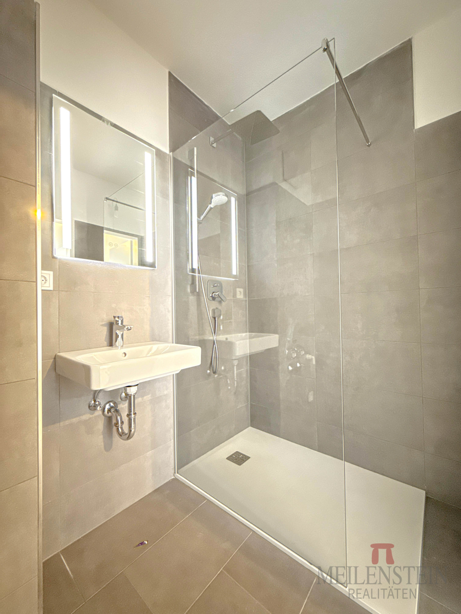 Das Badezimmer präsentiert sich modern und elegant mit bodengleicher Dusche, einer Glasduschwand, großformatigen Fliesen in Anthrazit, einem Waschbecken, einem Anschluss für die Waschmaschine sowie einem praktischen Handtuchtrockner.
