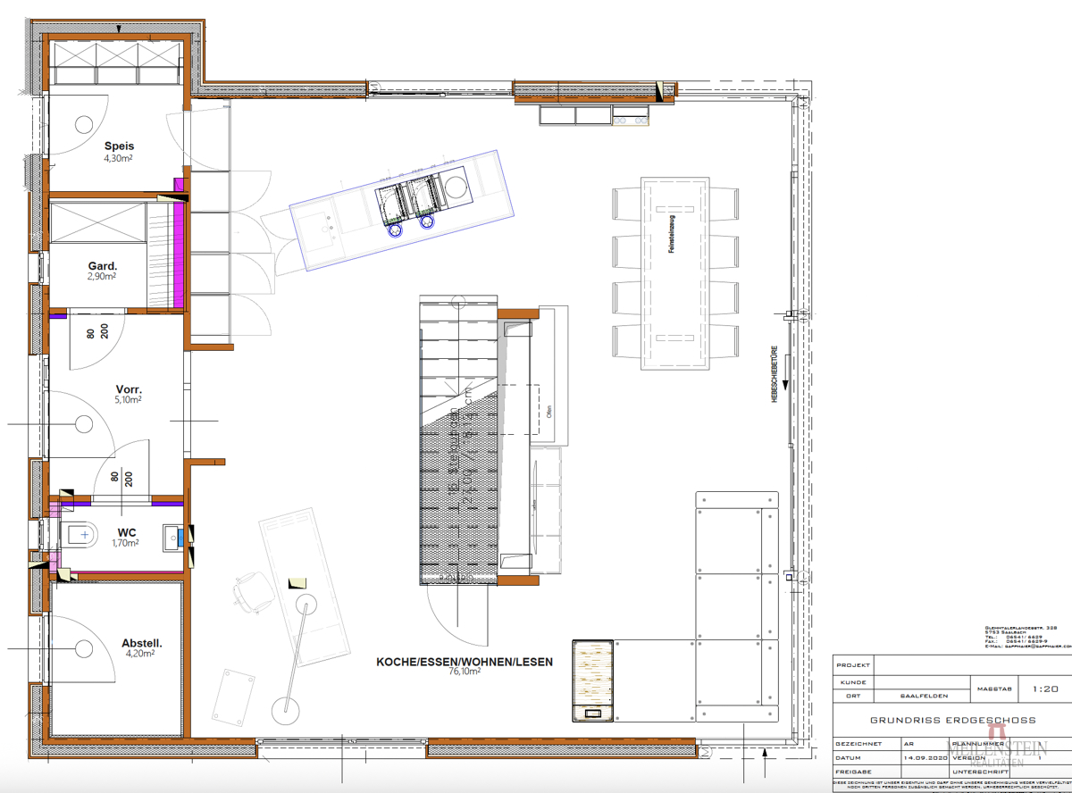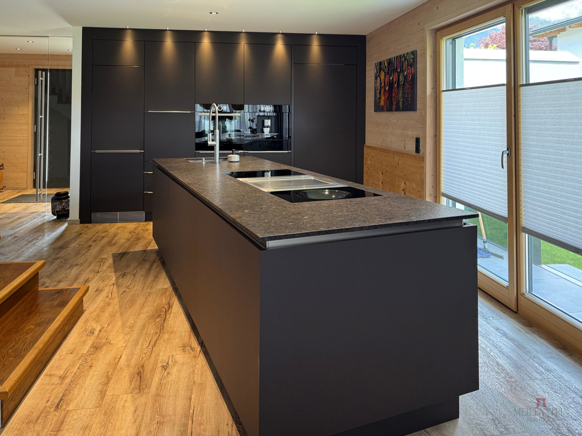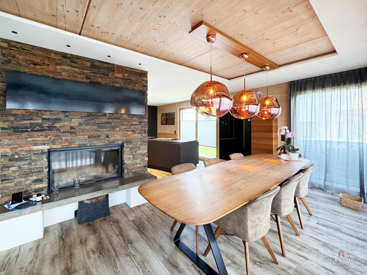 Erdgeschoss: Im Eingangsbereich befindet sich eine begehbare Garderobe und ein Gäste WC. Von dort aus gelangt man in das Herzstück des Hauses, den offen gestalteten Wohnbereich (76,10 m²), mit hochwertiger Einbauküche und Speis, großzügigem Essplatz, gemütlicher Wohnlandschaft vor dem offenen Kamin und einer Büroecke. Große Fensterflächen schaffen ein helles Ambiente. Eine wunderschöne 29m2-Terrasse lädt zum Verweilen ein.