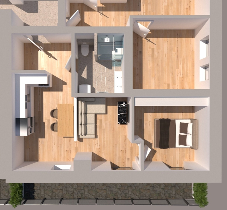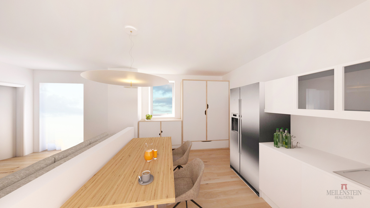 WHG 3 besticht durch ihre kompakte und gleichzeitig großzügig wirkende Aufteilung. Der helle Wohn- und Essbereich mit rund 24 m² ist das Herzstück der Wohnung und bietet direkten Zugang zum Balkon, der zusätzlichen Freiraum im Freien schafft. Das Schlafzimmer mit über 12 m² ist bestens geschnitten und bietet ausreichend Platz für Schrank und Doppelbett.