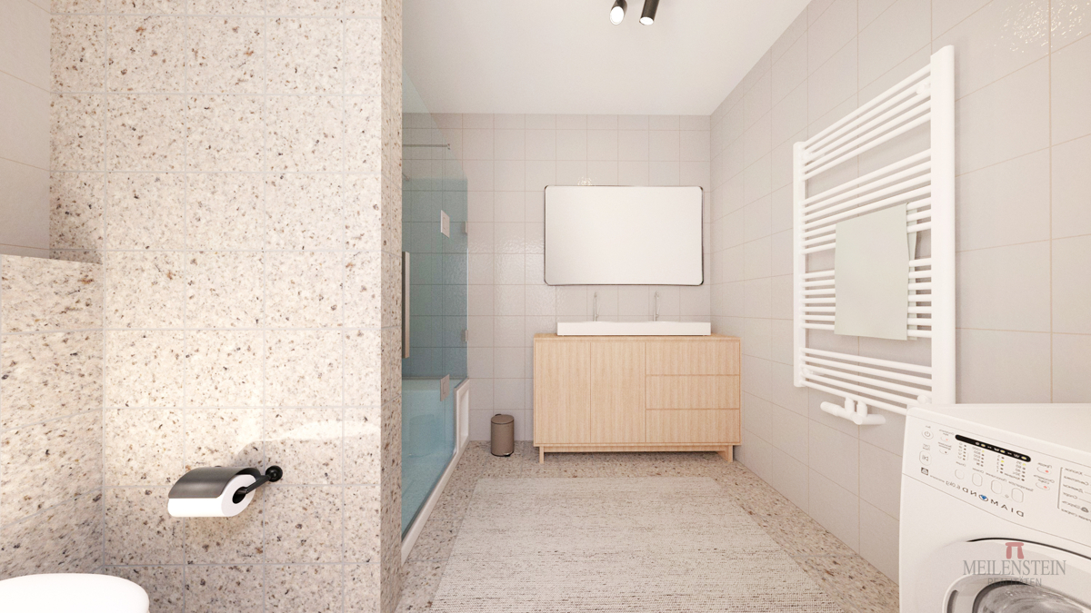 Das Badezimmer mit knapp 7 m² ist angenehm groß und umfasst Dusche, Waschbecken und WC. Ein praktischer Vorraum verbindet alle Räume effizient.