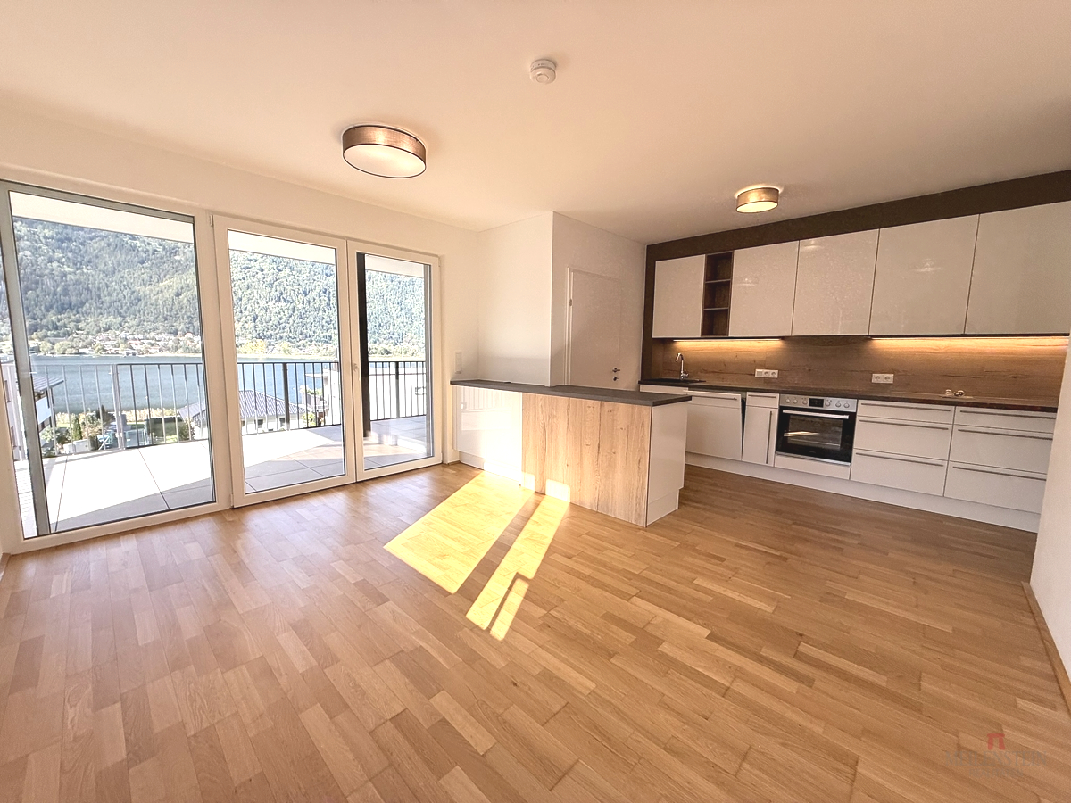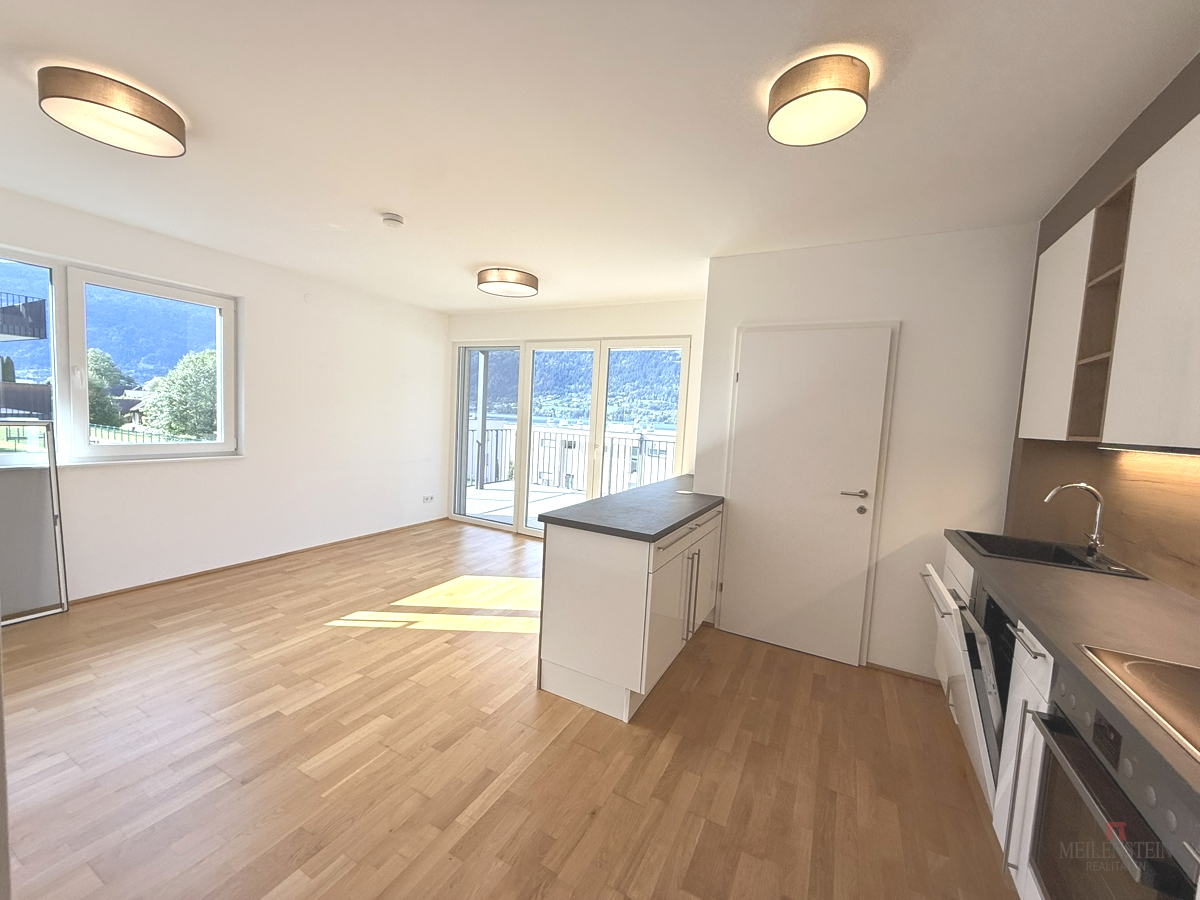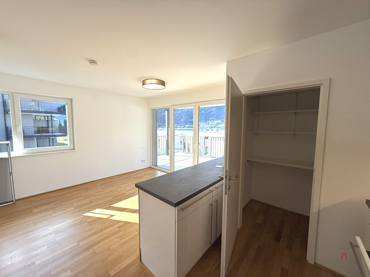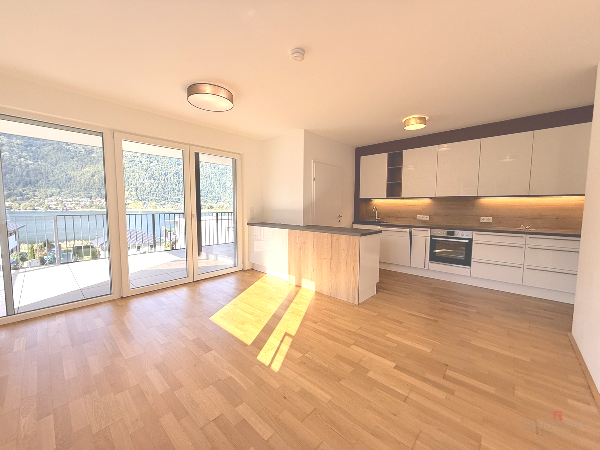 Raumaufteilung & Ausstattung: Die Wohnung überzeugt durch eine durchdachte Aufteilung und helle Räume mit Bezug zur Natur: Offener Wohn-Koch-Essbereich mit Ausgang auf die Seeblick Terrasse Moderne Küche mit separater Speis Zwei Schlafzimmer, beide mit Zugang zum Balkon und in den Garten Badezimmer mit Dusche und Badewanne Separates WC