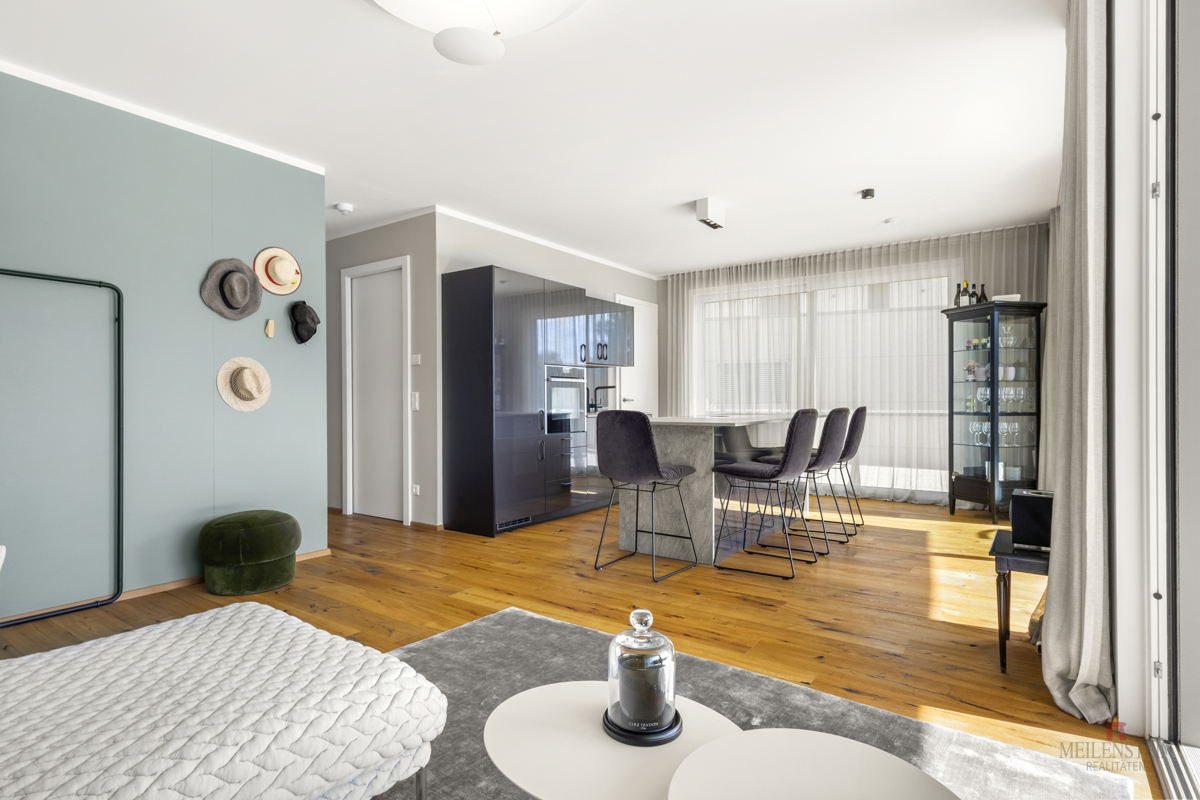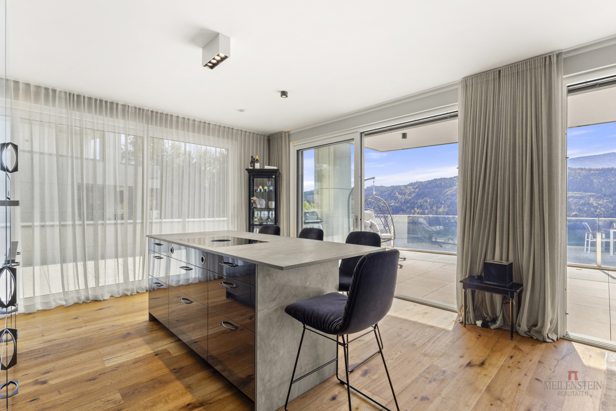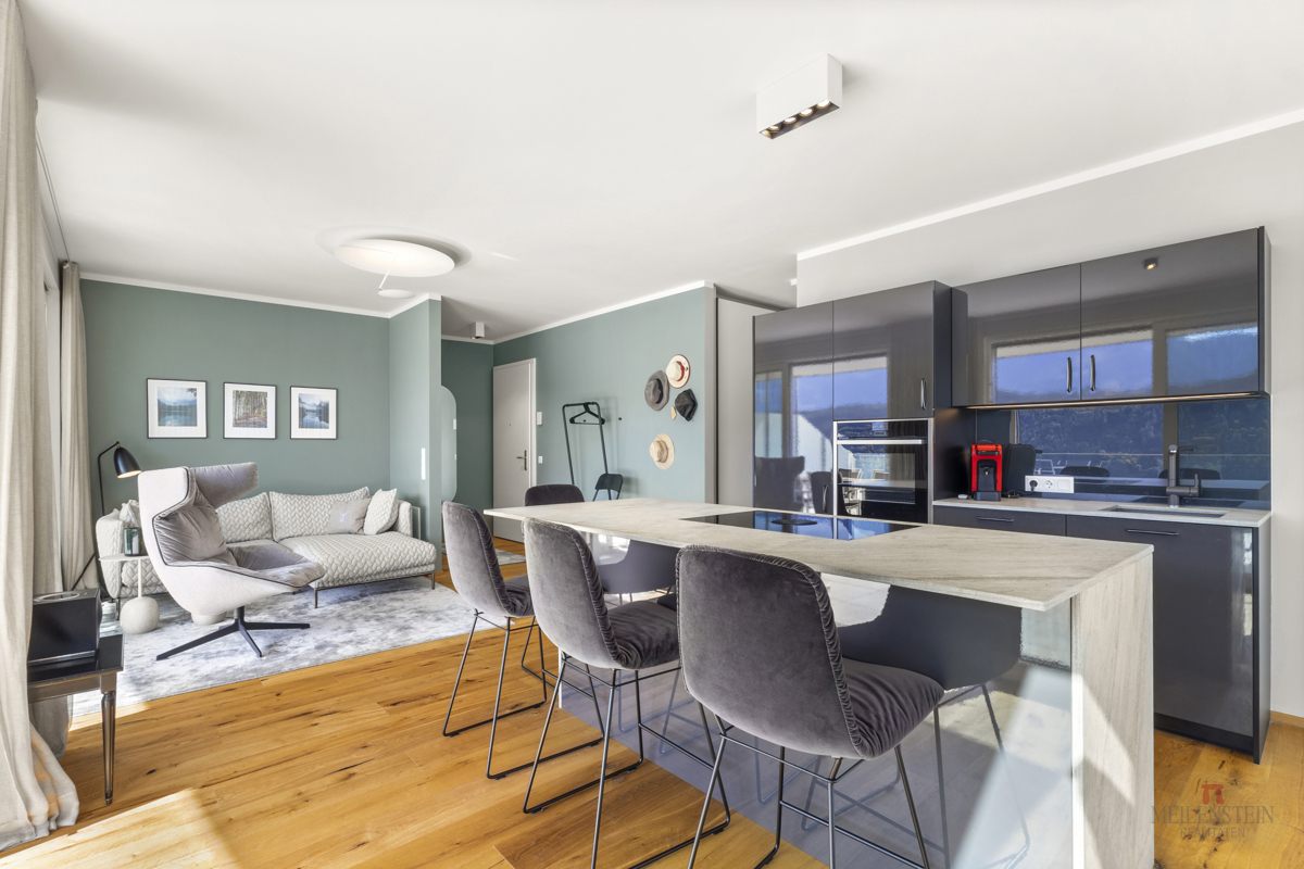 Schon beim Betreten eröffnet sich der spektakuläre Panoramablick auf den Millstätter See und die umliegende Bergwelt – dank der bodentiefen Glasfronten und des gläsernen Terrassengeländers ohne jede Sichtunterbrechung. Der großzügige Wohn- und Essbereich mit offener Tischlerküche bildet das Herzstück der Wohnung. Die maßgefertigte Designküche überzeugt mit edler Steinplatte, Bora-Kochfeld und integrierter Kücheninsel, die zugleich als Essbereich dient. Hochwertige Eichenparkettböden, Designleuchten von Flos sowie zahlreiche Tischlereinbauten unterstreichen den exklusiven Charakter.